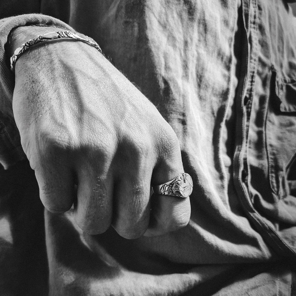 Cracked stone was inspired by marble and our great love for stone textures. The top part of the ring is flat and relatively simple, in that way the design preserves the look of the classic round signet ring.